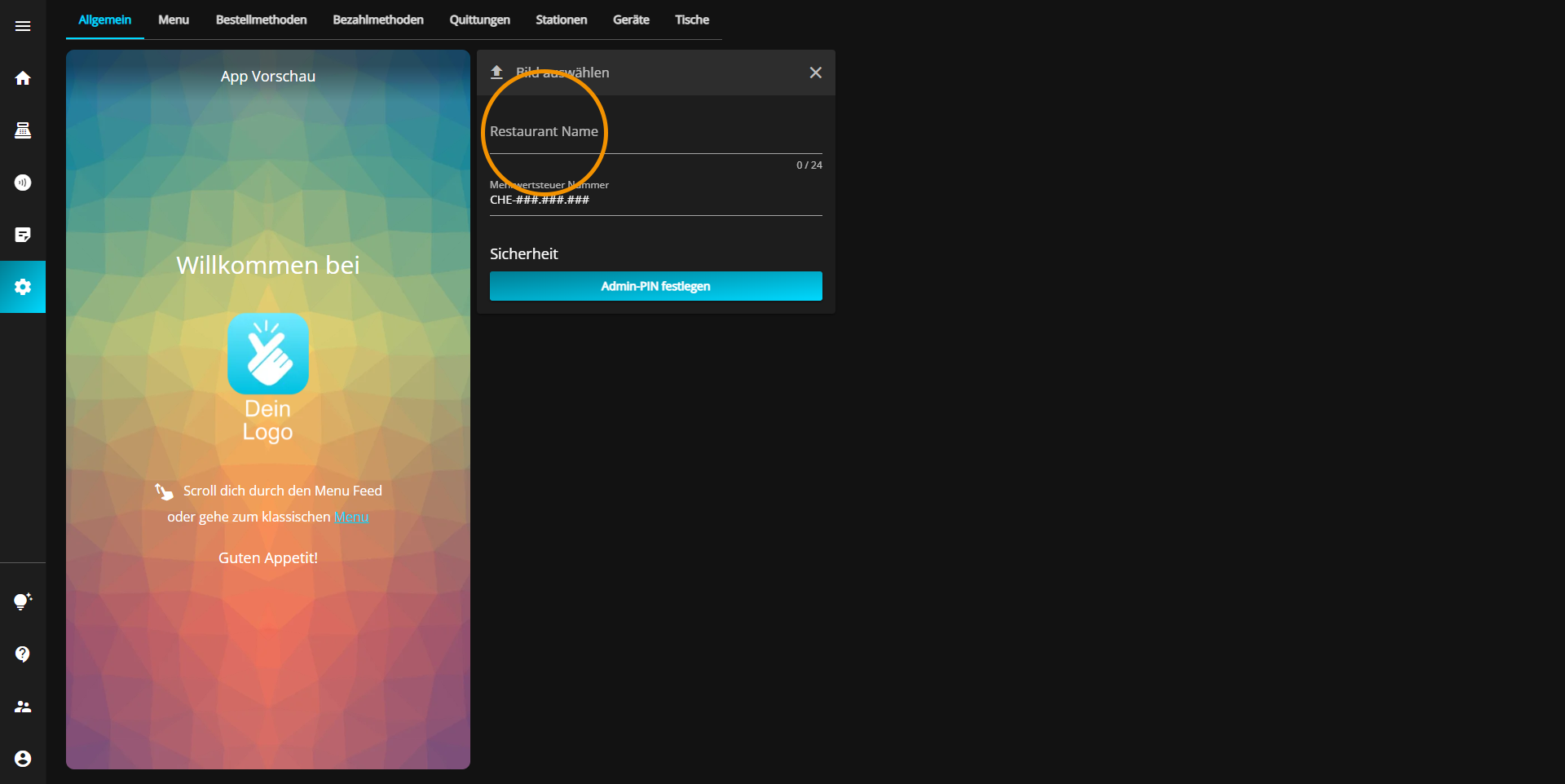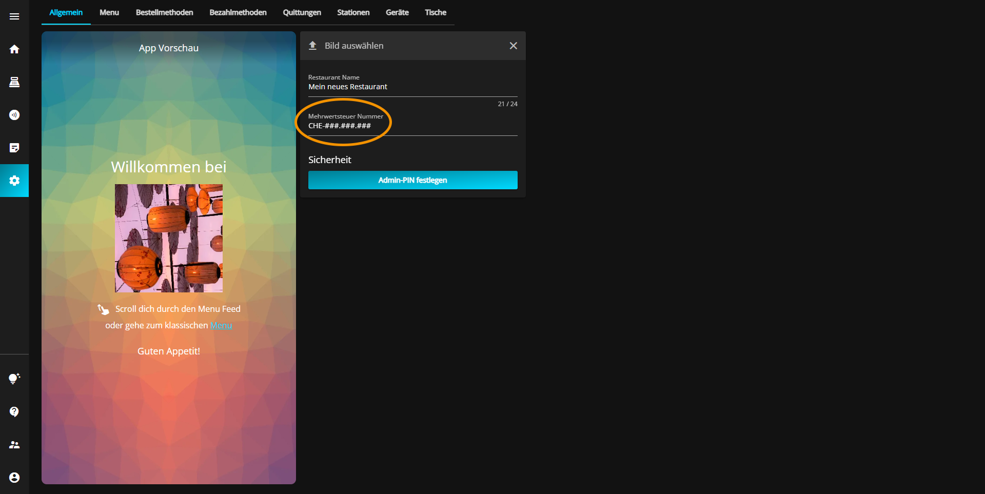 Klicken Sie dafür in das Feld mit der Überschrift "Mehrwertsteuer Nummer" welches sich direkt unter dem Restaurant Namen befindet.