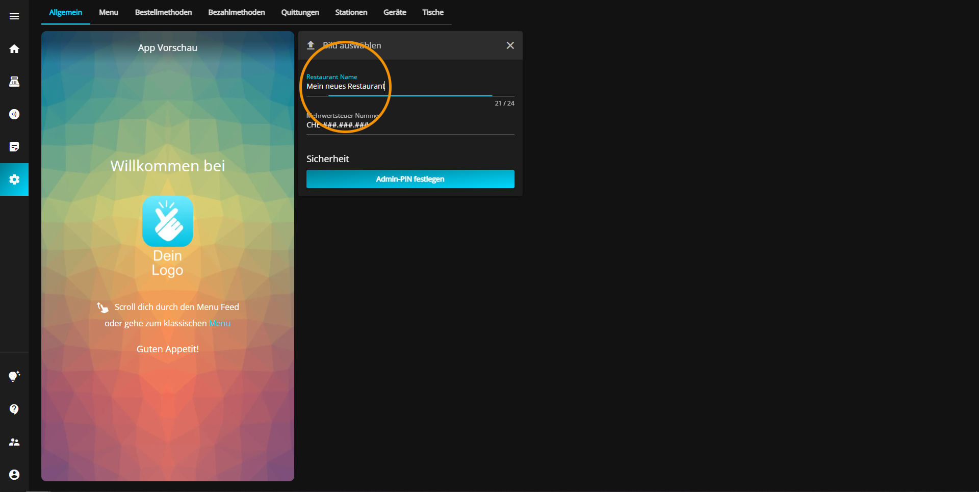 Klicken Sie dafür in das Textfeld mit der Überschrift "Restaurant Name" welches sich direkt unter dem "Bild auswählen" Feld befindet.