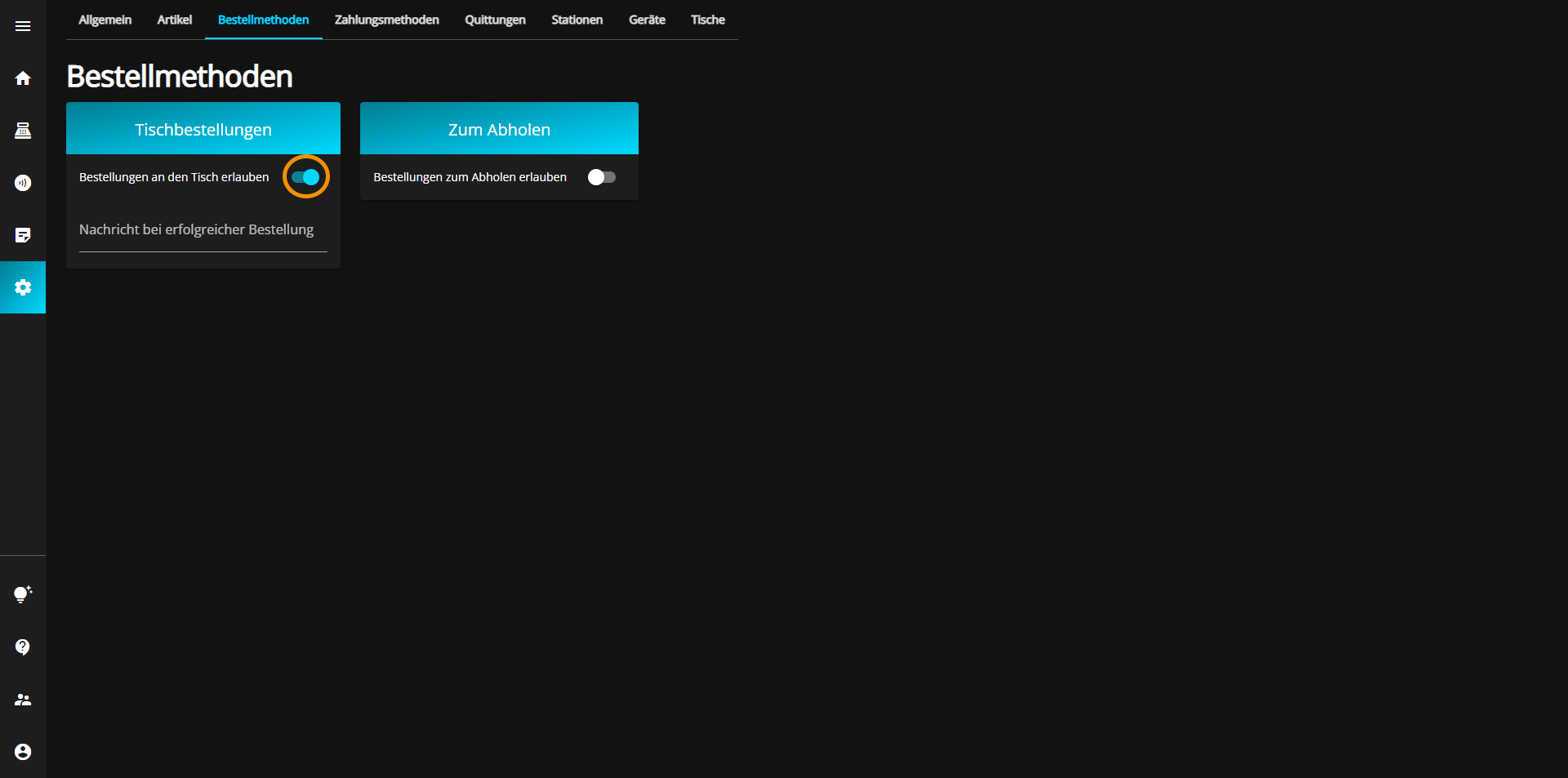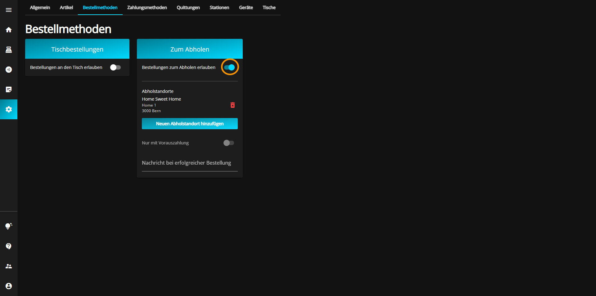 Sie können die Möglichkeit "Bestellungen zum Abholen" aktivieren (Blau) oder deaktivieren (Grau) indem Sie auf die Schaltfläche "Bestellungen an den Tisch erlauben" klicken.