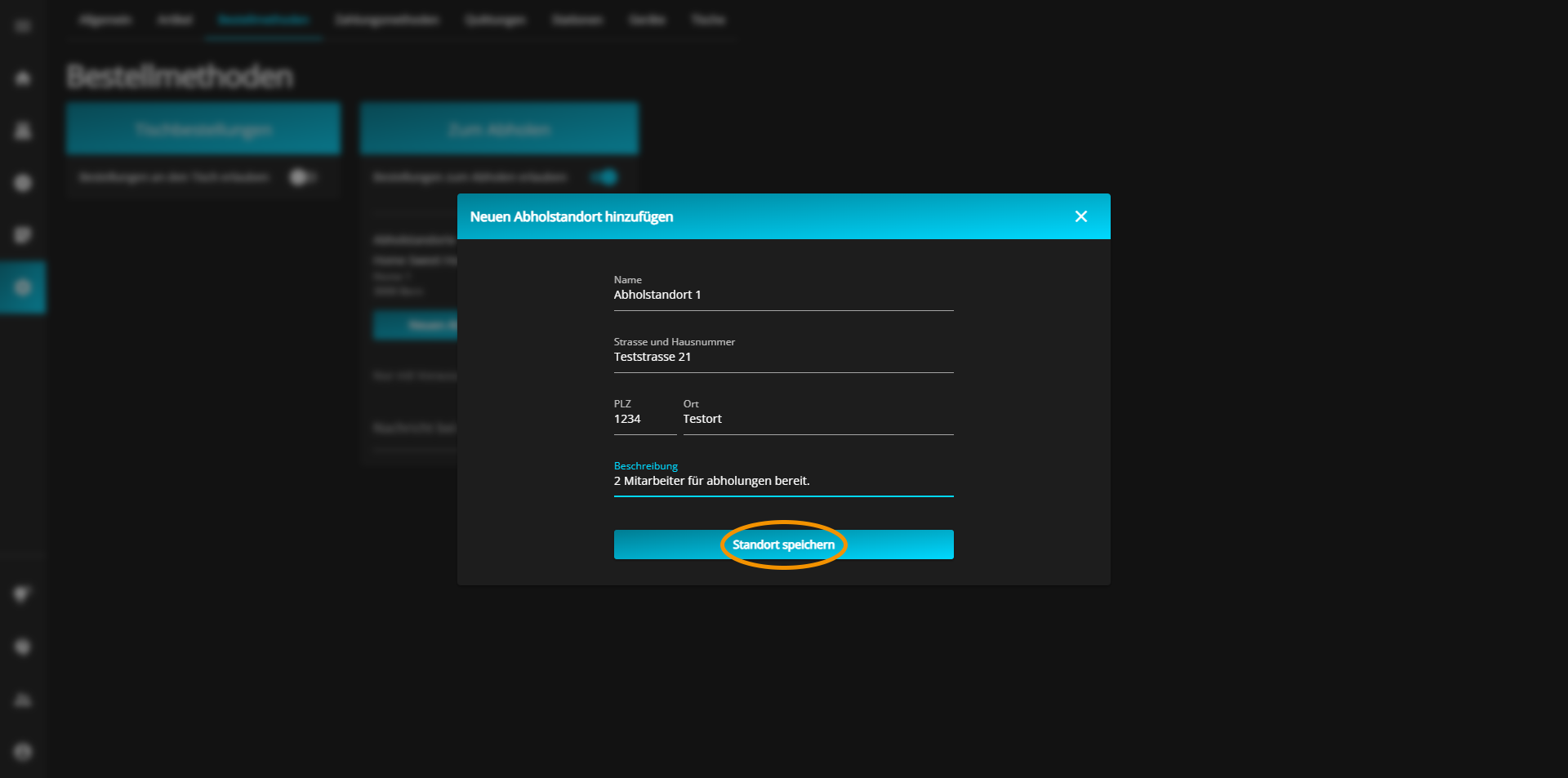 Nach Aktivierung dieser Option müssen Sie die Abholadresse angeben bei welcher das Essen abzuholen ist.