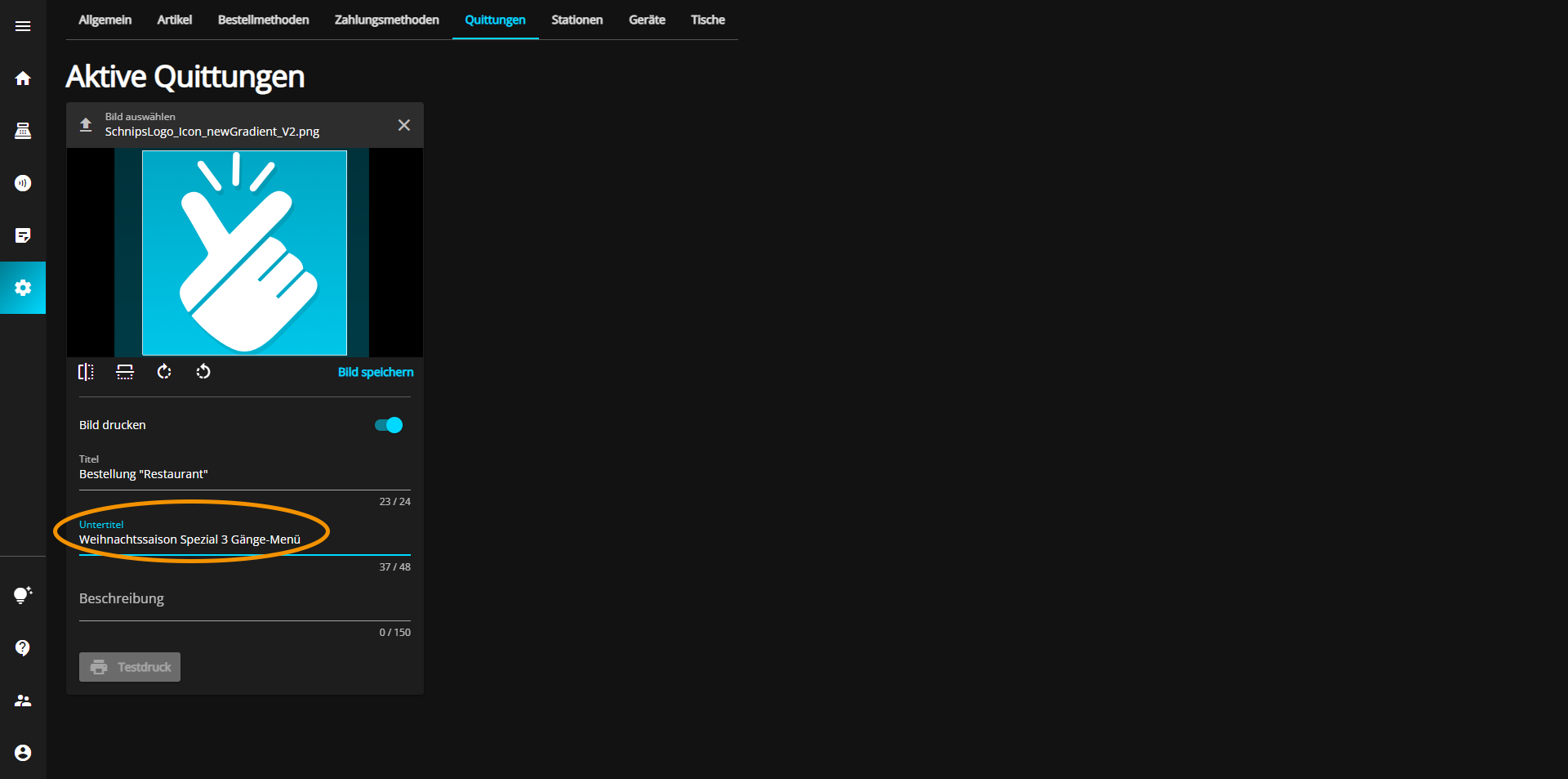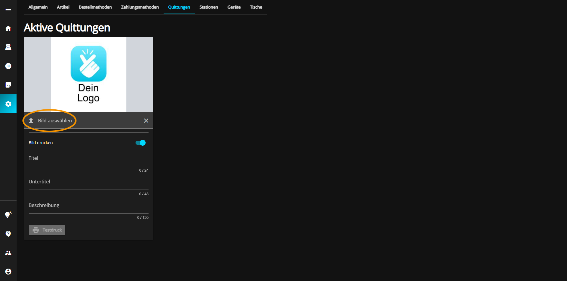 Der Quittungskopf kann über die Schaltfläche "Bild drucken" aktiviert (Blau) oder deaktiviert (Grau) werden, jenachdem ob Sie diesen auf der Quittung ersichtlich haben möchten oder nicht.