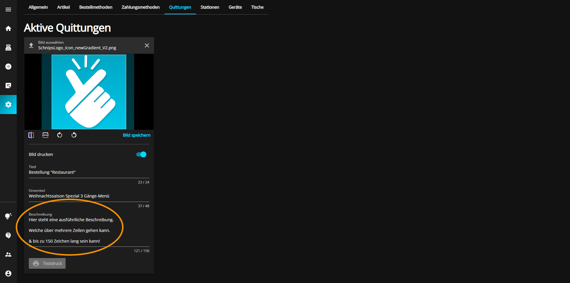 Wenn Sie mit ihren Informationen zufrieden sind, haben Sie jetzt noch die Möglichkeit eine Testquittung zu drucken. Dafür müssen Sie lediglich auf den "Testdruck" Knopf drücken.