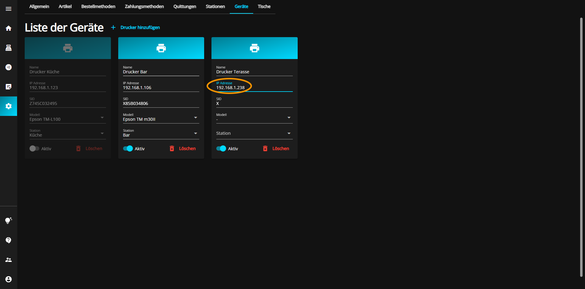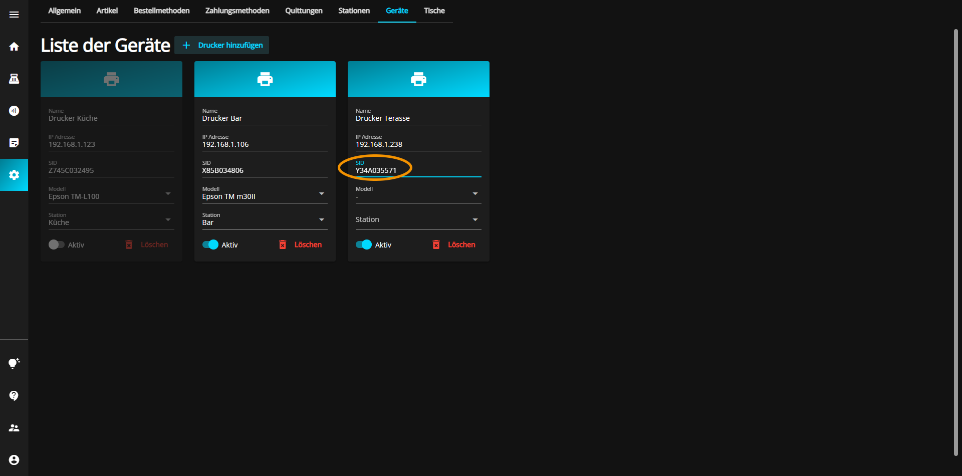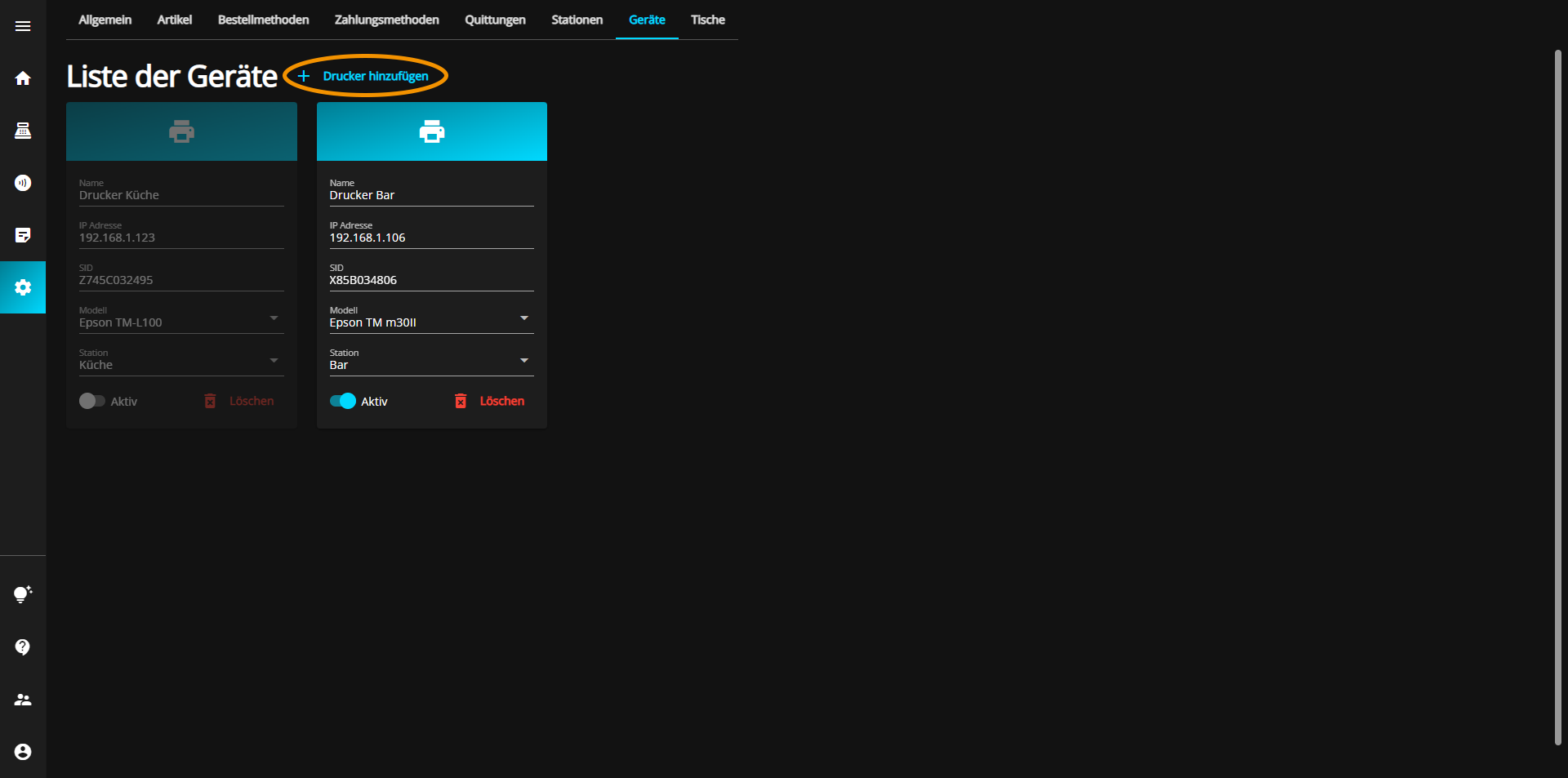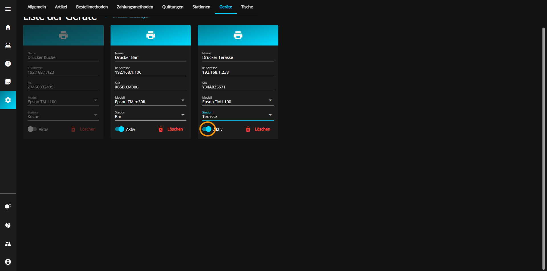 Sie haben die Möglichkeit jeden Drucker zu jeder Zeit zu aktivieren (Blau) oder zu deaktivieren (Grau) indem Sie die Schaltfläche "Aktiv" am unteren linken Rand des Gerätetabs umschalten.