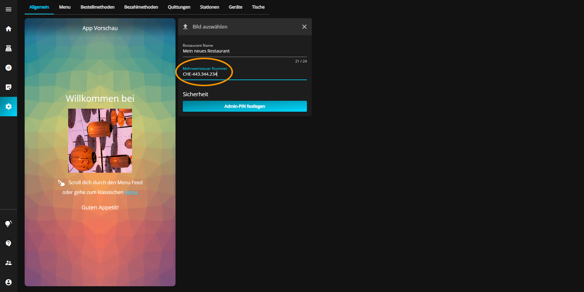 You can change the VAT number of your restaurant at simplyorder.ch/dashboard/settings