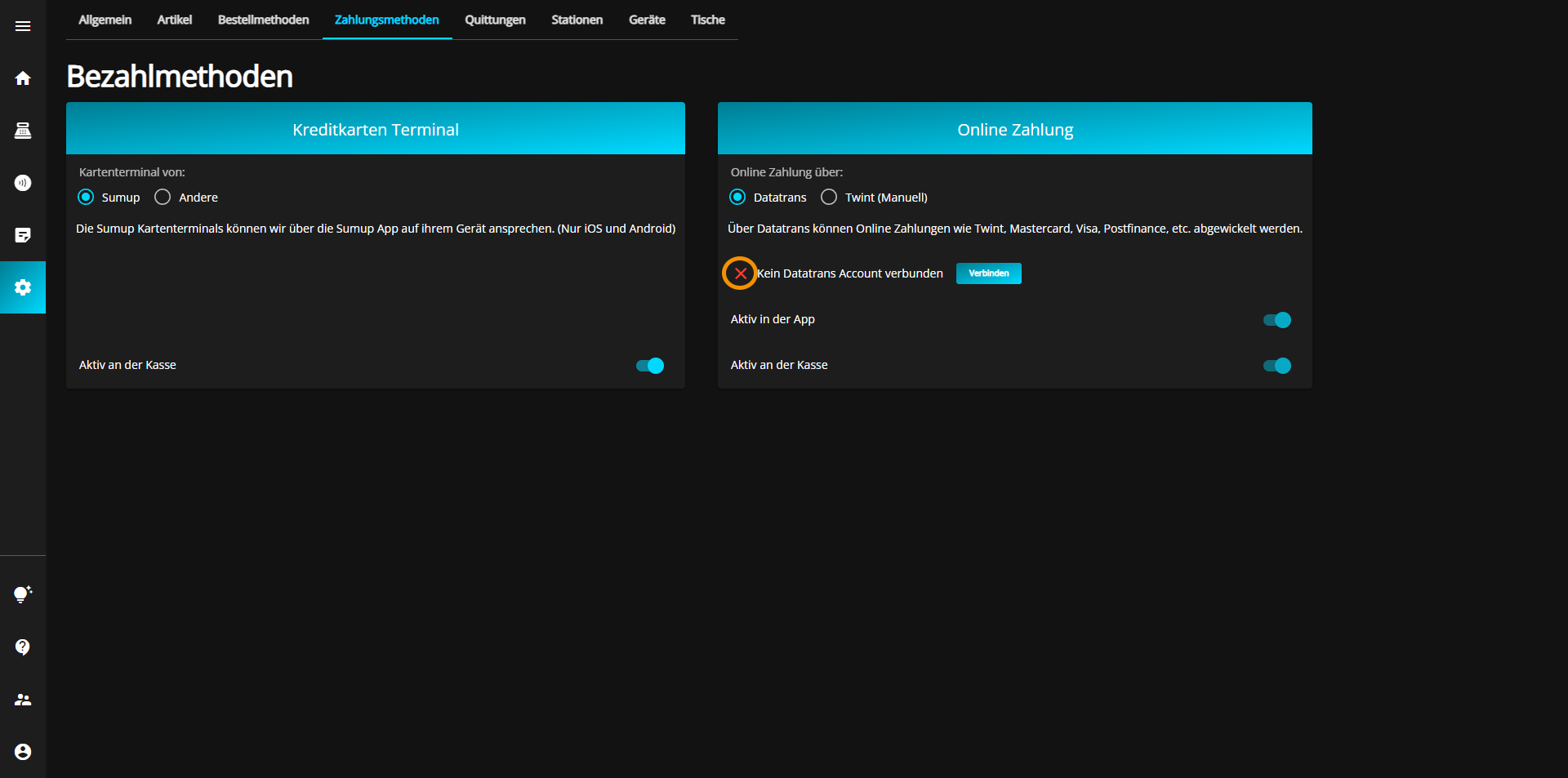 If you would like to use Datatrans for online payments, click on the "Datatrans" button.