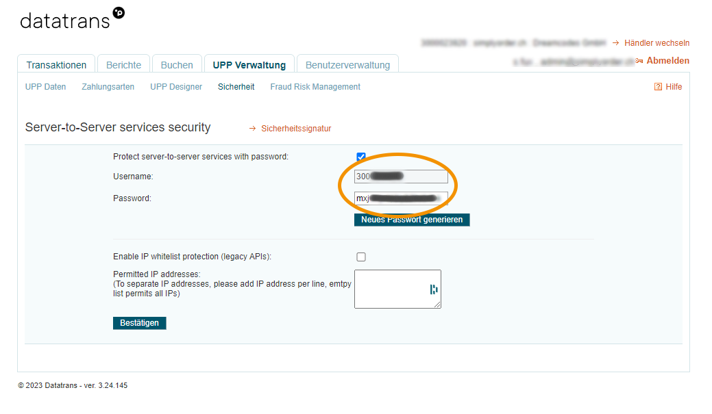 Another window with two text fields will open. Click on the link at the bottom of this window to be redirected to the Datatrans UPP administration.