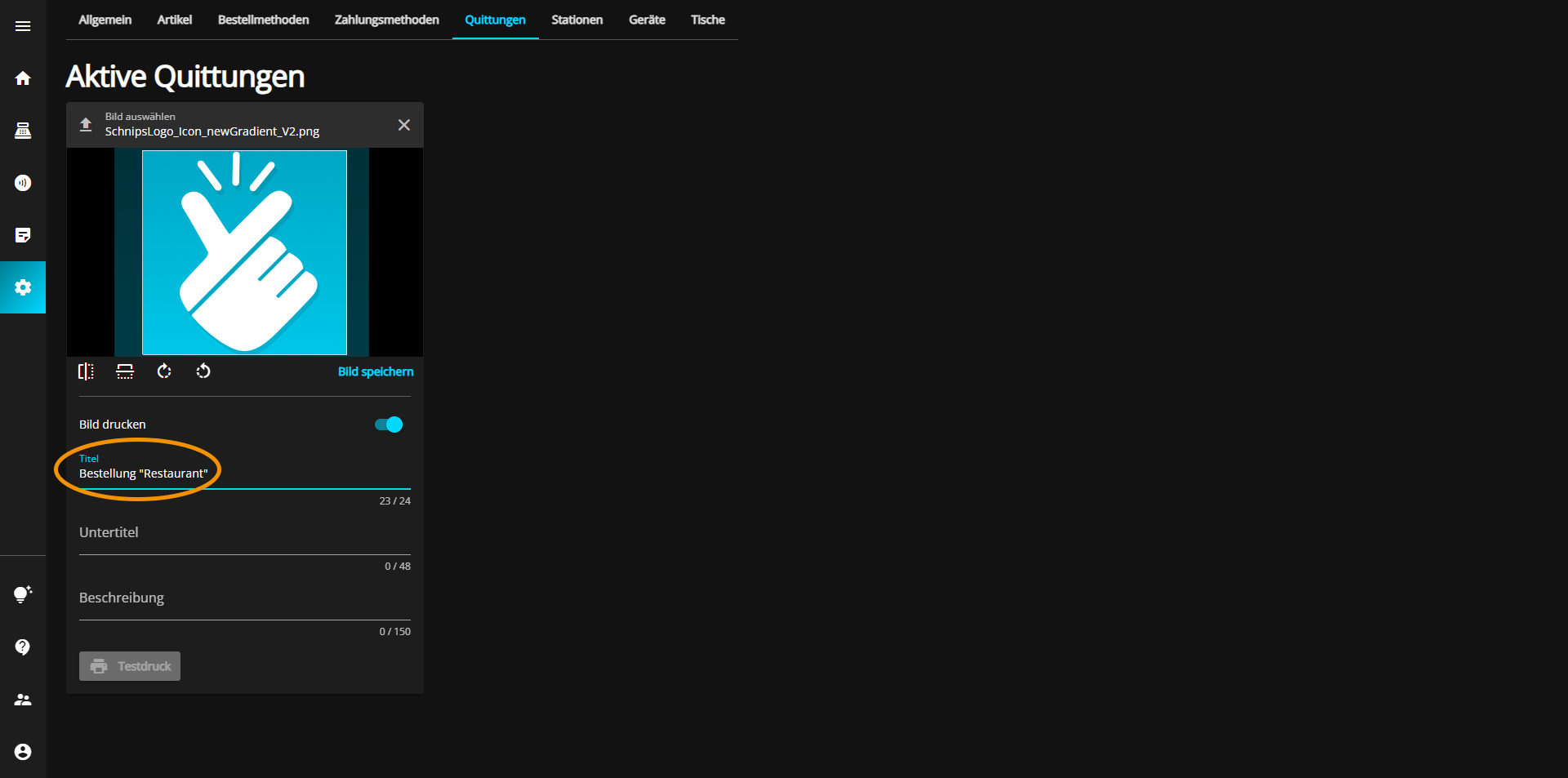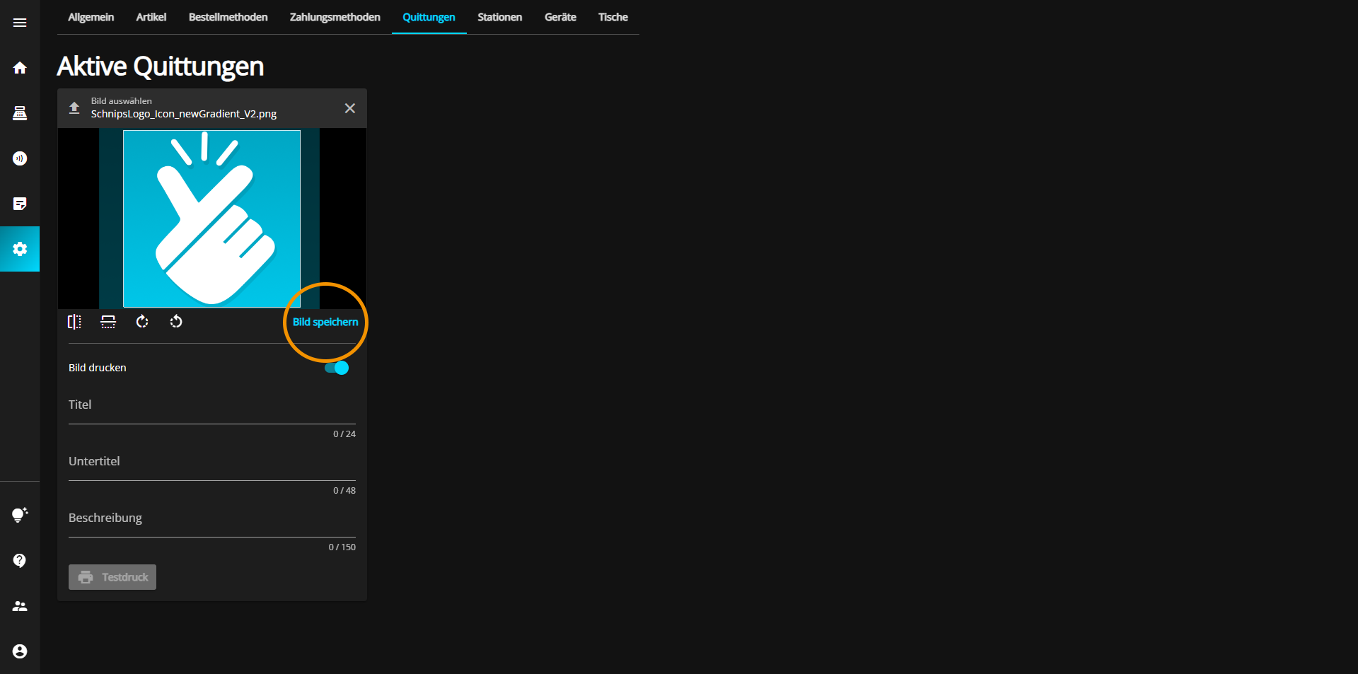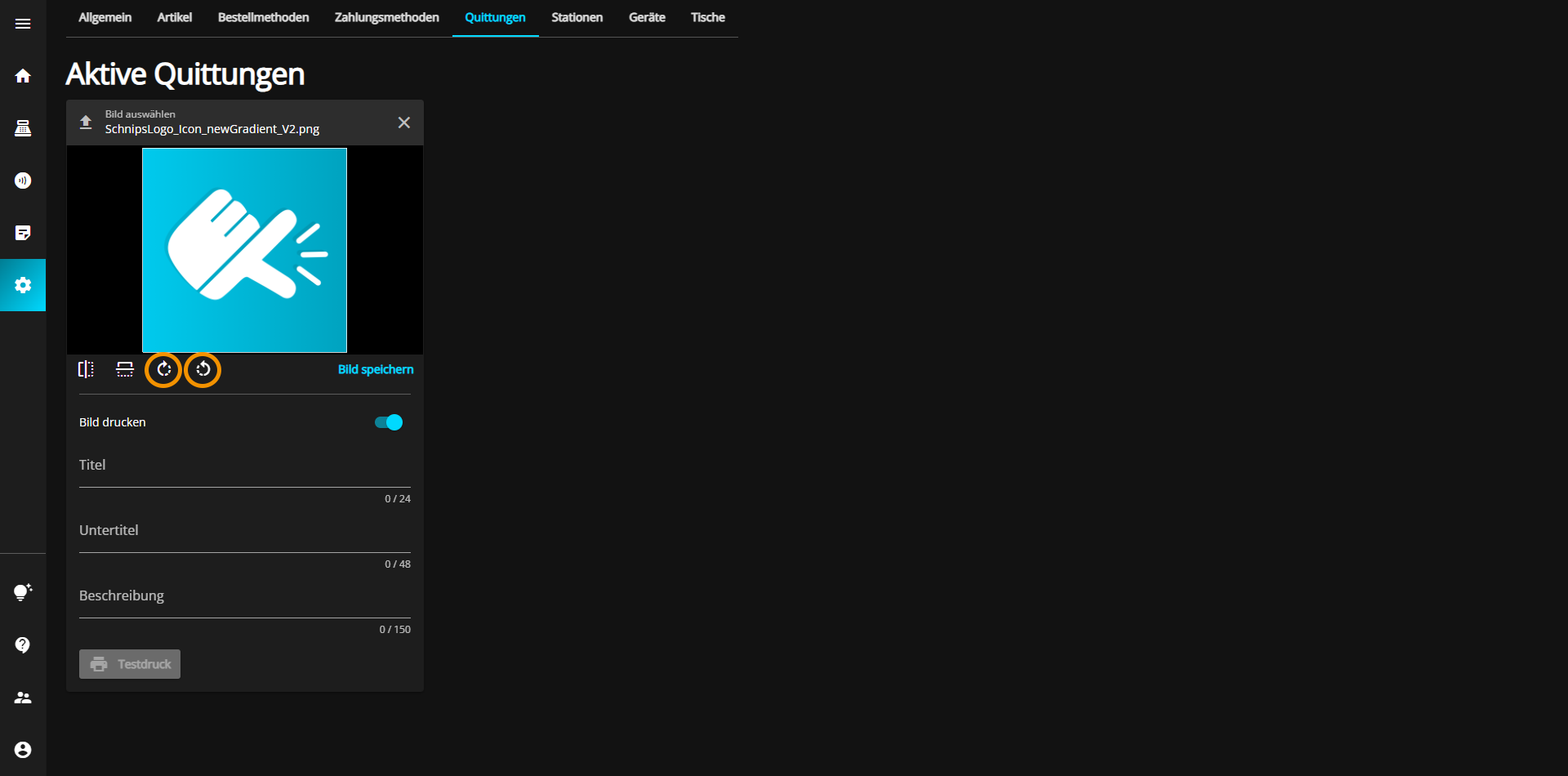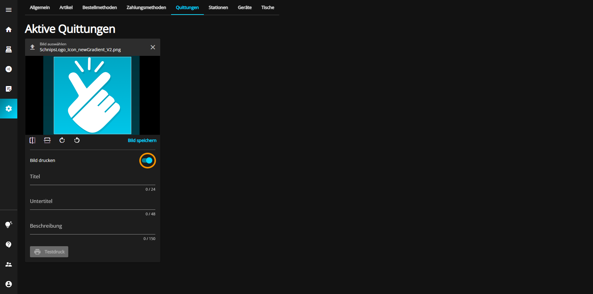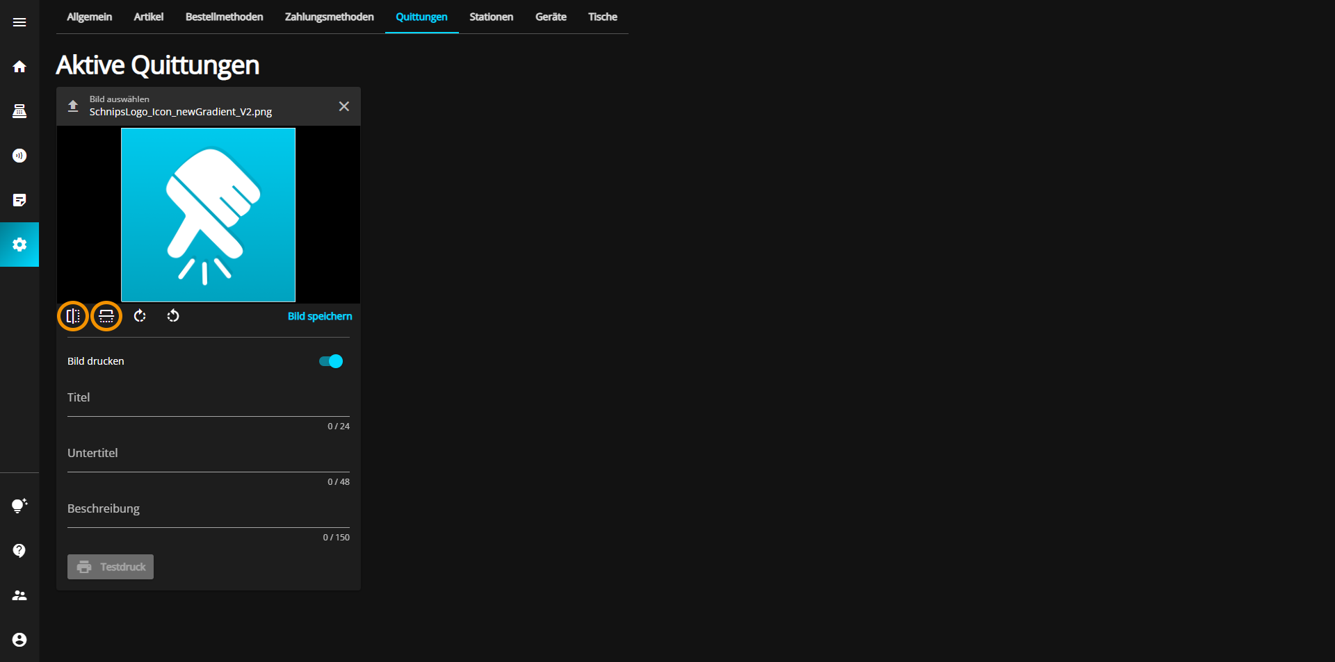 The receipt header can be activated (blue) or deactivated (gray) via the "Print image" button, depending on whether you want it to be visible on the receipt or not.