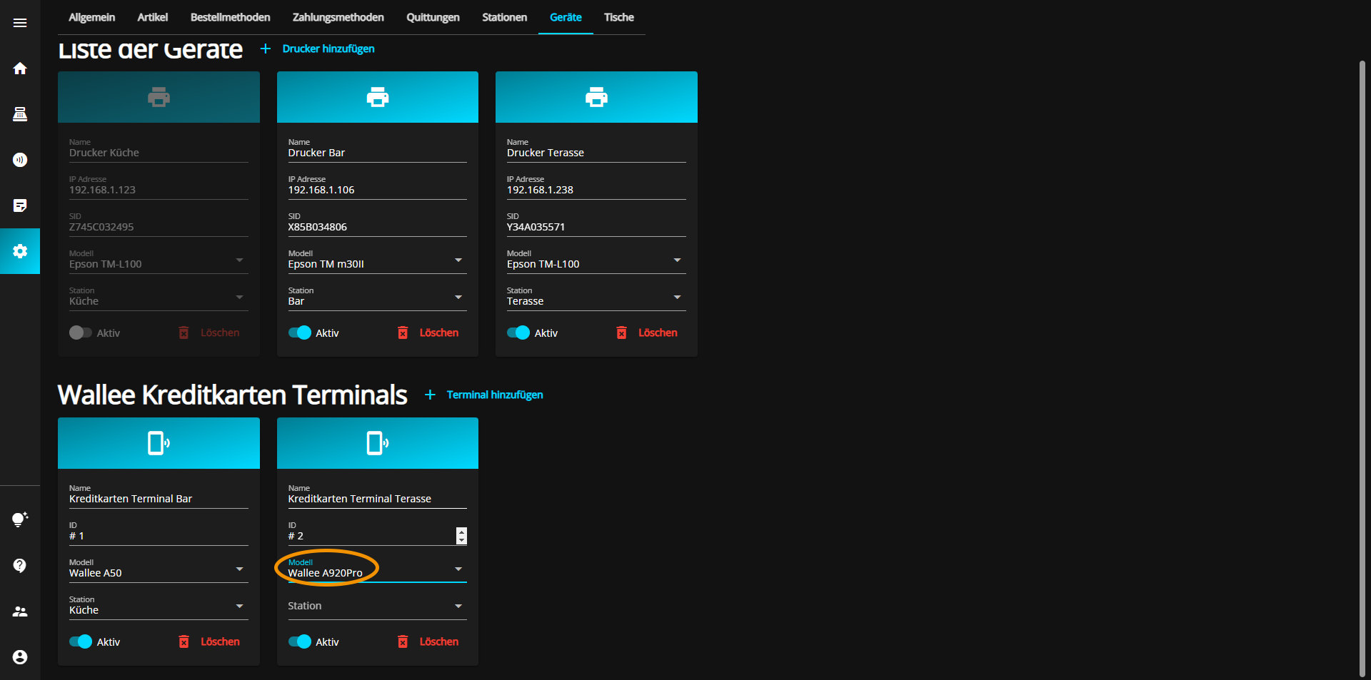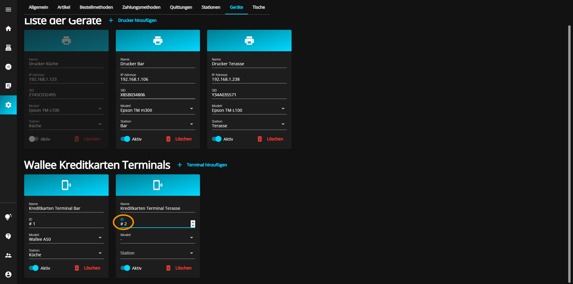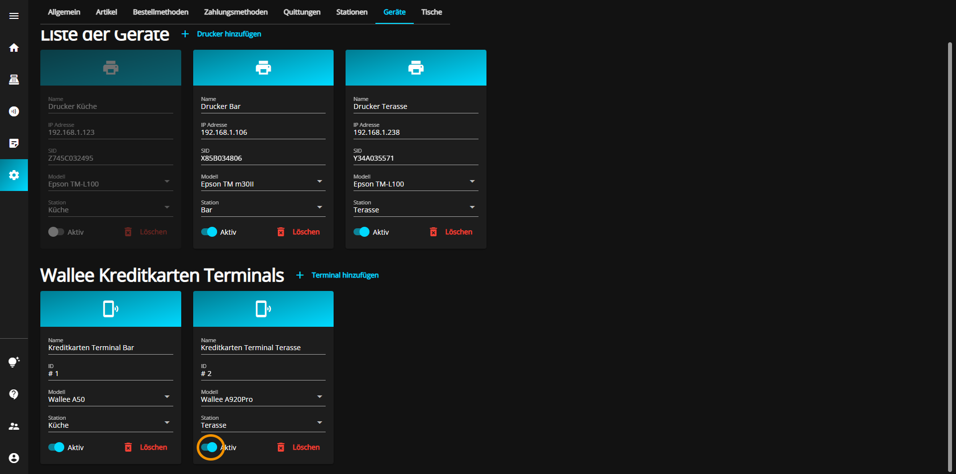 You have the option of activating (blue) or deactivating (gray) each terminal at any time by toggling the "Active" button at the bottom left of the device tab.