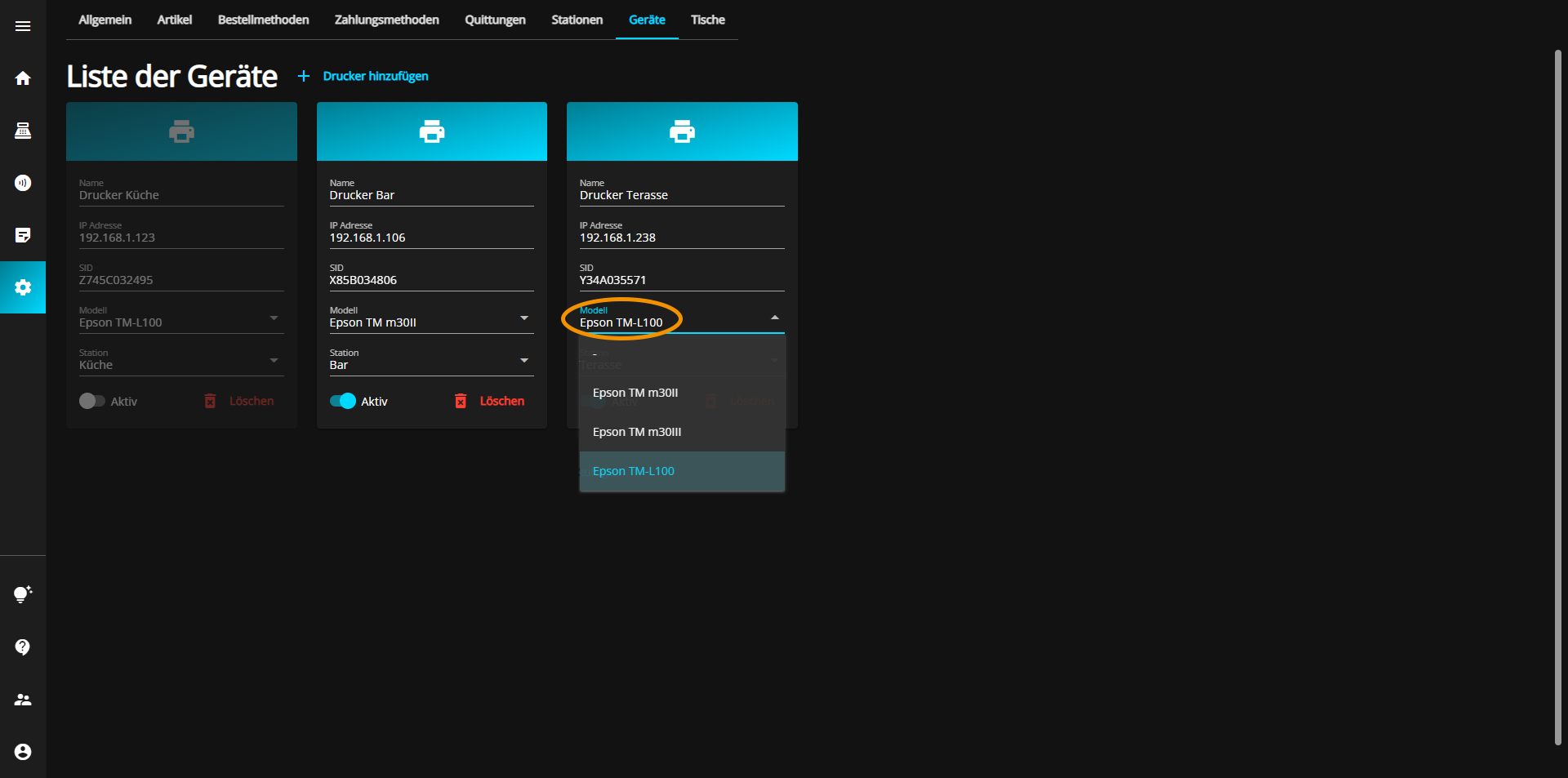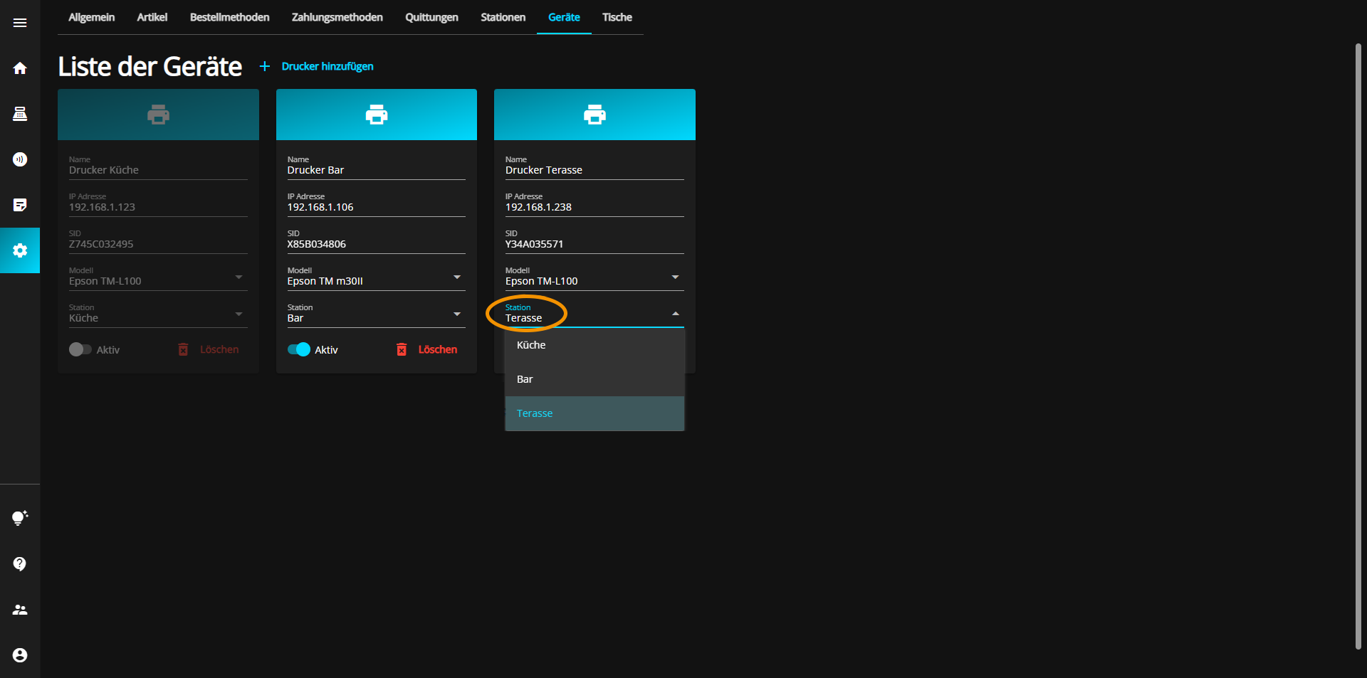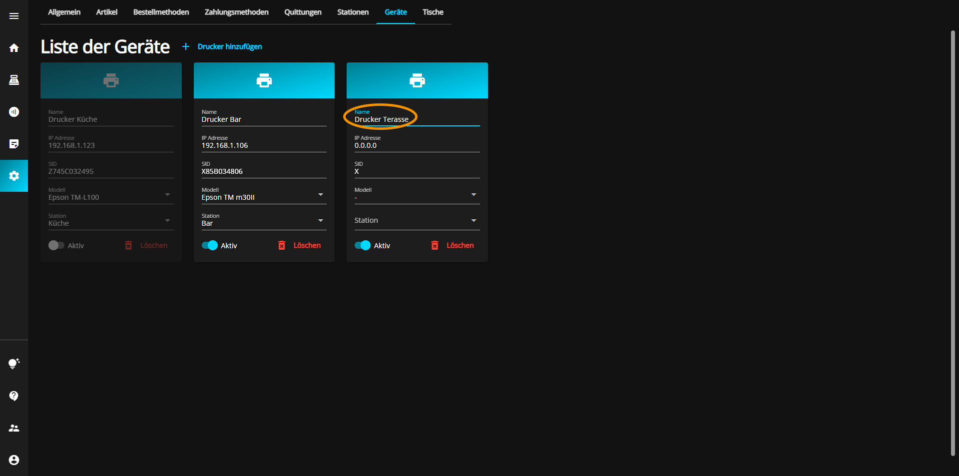 You have the option of activating (blue) or deactivating (gray) each printer at any time by toggling the "Active" button at the bottom left of the device tab.
